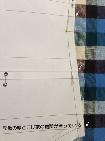 ![]() | 前身頃の型紙で裾から上に向かってこげ茶の位置を書いていくと、脇では袖ぐりから1㎝下がったところがこげ茶のラインでした。 後身頃も同じ高さになるように線を引いておきます。 |