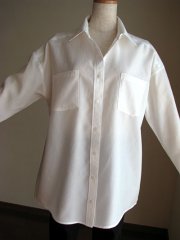 パリッとしたタイプライタークロスで作りました。ボリュームのあるシャツなのでスキニーなどすっきりしたパンツと合わせるのがおすすめです。ゆるシャツでも衿はコンパクトにしたのでだらしなく見えません。 ボディ B94 肩幅44 H94 サンプル使用生地:ウェア向き タイプライタークロス(ダンプ) 1【メール便3m可】 布と手芸つばめやさま